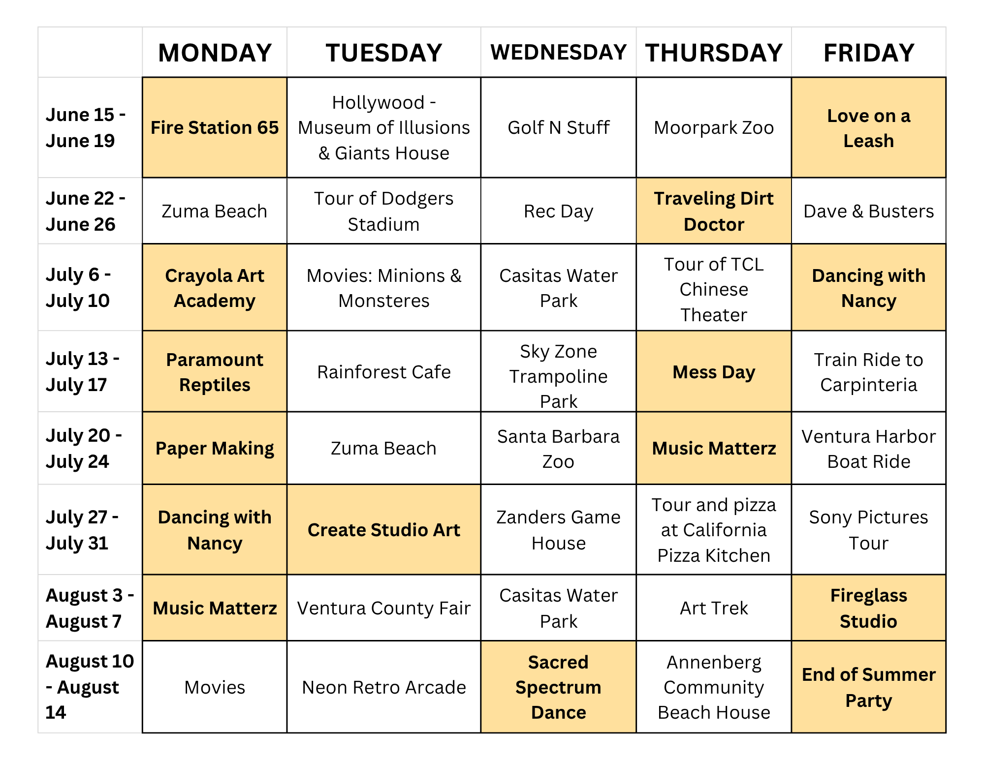 Monday 6.22: Zuma Beach. Soak up the sun with a relaxing beach day full of sand, surf, games, and ocean breezes. Picnic Lunch